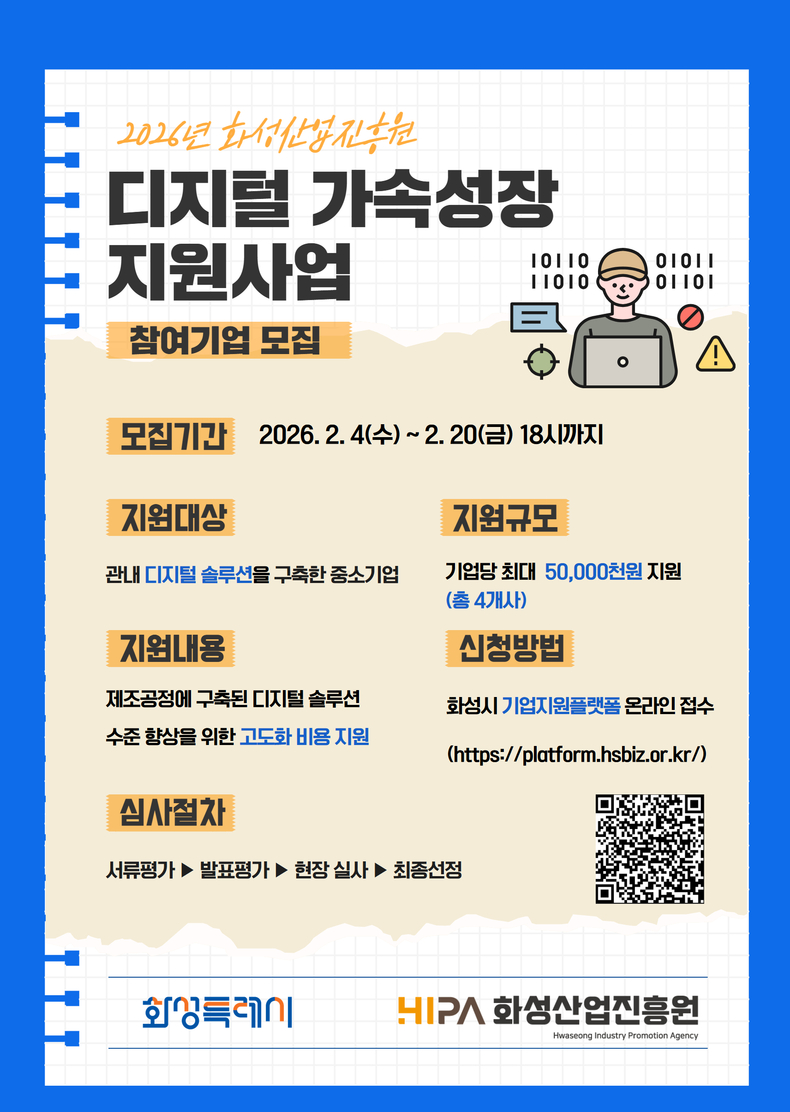 (시사미래신문) 화성산업진흥원(원장 전병선)은 기업 환경 전반의 디지털 혁신 확산과 생산성 향상을 지원하는‘2026년 디지털 가속성장 지원사업' 참가기업을 오는 2월 20일까지 모집한다고 밝혔다.