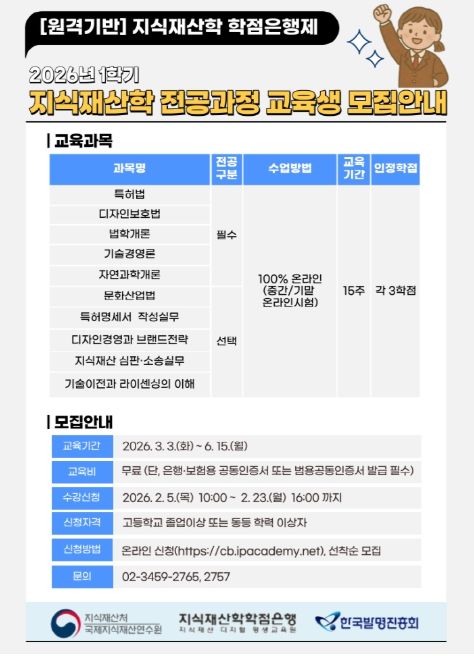 (시사미래신문) 지식재산처 국제지식재산연수원은 한국발명진흥회와 공동으로 2월 5일부터 23일까지 지식재산학 학점은행 과정에 대한 온라인 수강생을 모집한다.