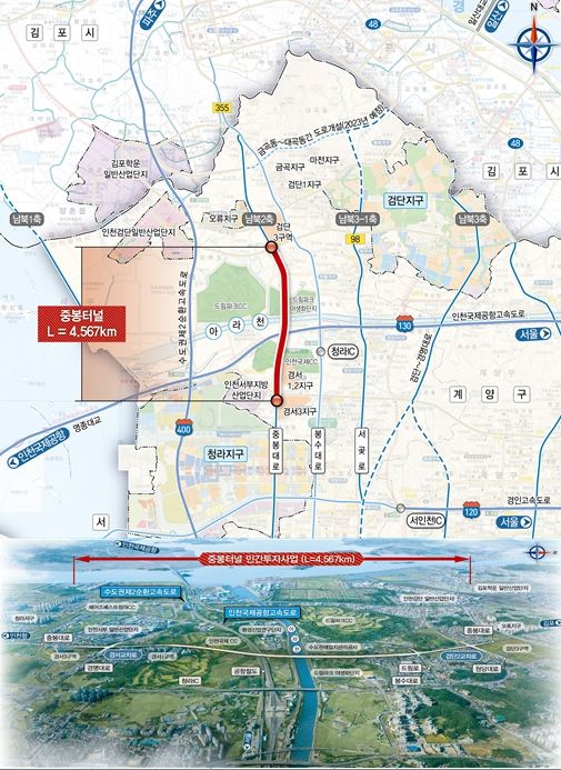 중봉터널 건설사업은 남북 2축 중 단절된 중봉대로(서구 경서동과 왕길동 구간)를 연결하는 총연장 4.57km, 왕복 4차로 규모의 민간투자사업으로 국비 512억 원이 투입되며 봉수대로와 서곶로 일대의 교통혼잡을 완화할 것으로 기대된다.