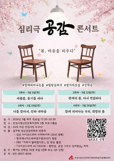 20세 이상 안성시민 누구나 무료로 참여할 수 있으며, 신청은 2월 6일부터 3월 25일까지 QR코드 또는 안성시정신건강복지센터 홈페이지를 통해 선착순으로 120명을 모집한다.