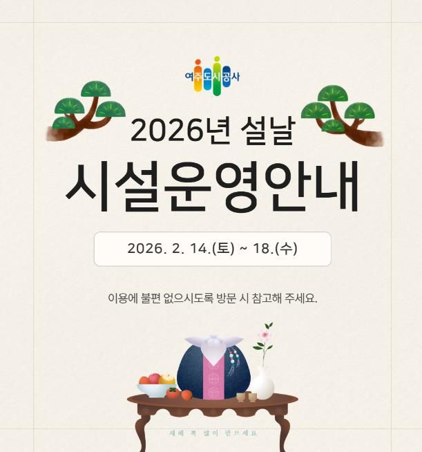 (시사미래신문) 여주도시공사가 다가오는 2026년 설 연휴를 맞아 시민과 귀성객들이 안전하고 편안한 명절을 보낼 수 있도록 주요 시설 운영시간 조정 및 특별 서비스를 시행한다고 밝혔다.