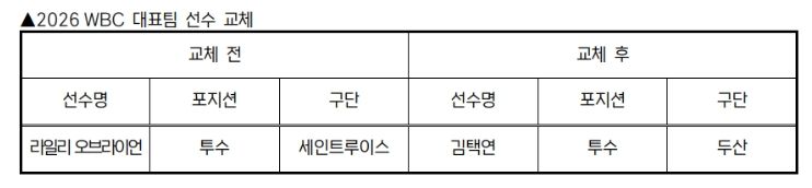 (시사미래신문) KBO 전력강화위원회는 부상으로 인해 WBC 참가가 어려워진 세인트루이스 라일리 오브라이언을 대체할 선수로 두산 김택연을 확정하고 WBC 조직위에 선수 교체 승인을 요청했다.