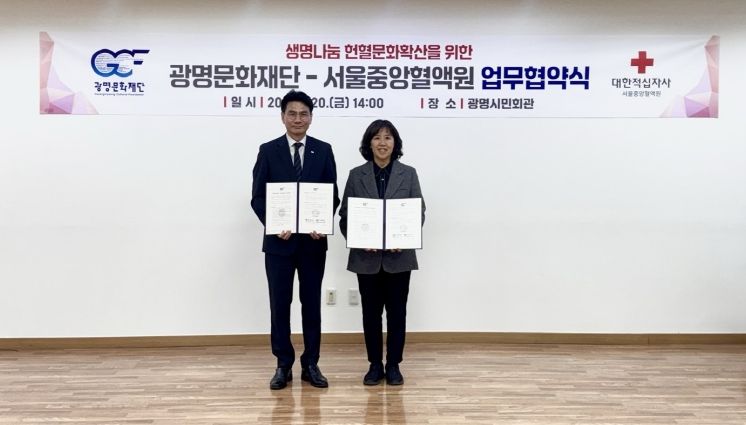 (시사미래신문) (재)광명문화재단(대표이사 송은영)은 서울중앙혈액원(원장 이재용)과 함께 2월 20일 오후 2시에 광명시민회관에서 '헌혈자 대상 문화예술 프로그램 제공 및 헌혈 문화 정착을 위한 업무협약'을 체결했다고 밝혔다.