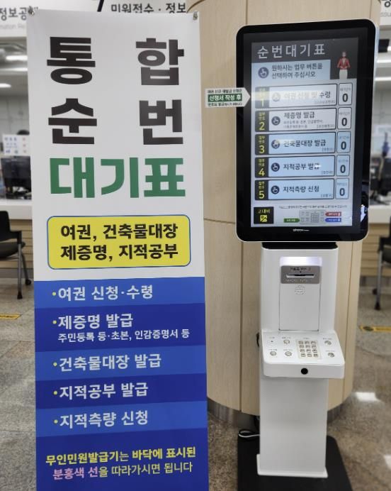 시는 기존에 업무별로 분리 운영하던 순번기를 정비하고, 종합민원실에 순번대기 키오스크 2대를 설치해 통합 운영 체계를 마련했다.