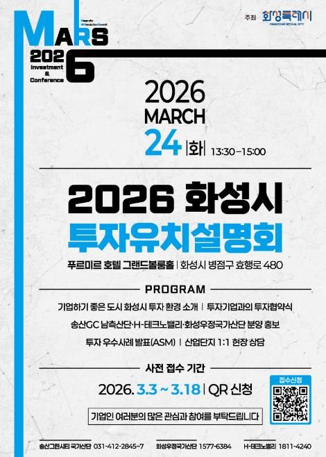 (시사미래신문) 화성특례시가 오는 3월 24일 푸르미르 호텔에서 ‘2026 화성특례시 투자유치 설명회’를 개최하고, 3월 3일부터 3월 18일까지 QR코드를 통한 사전접수를 진행한다.
