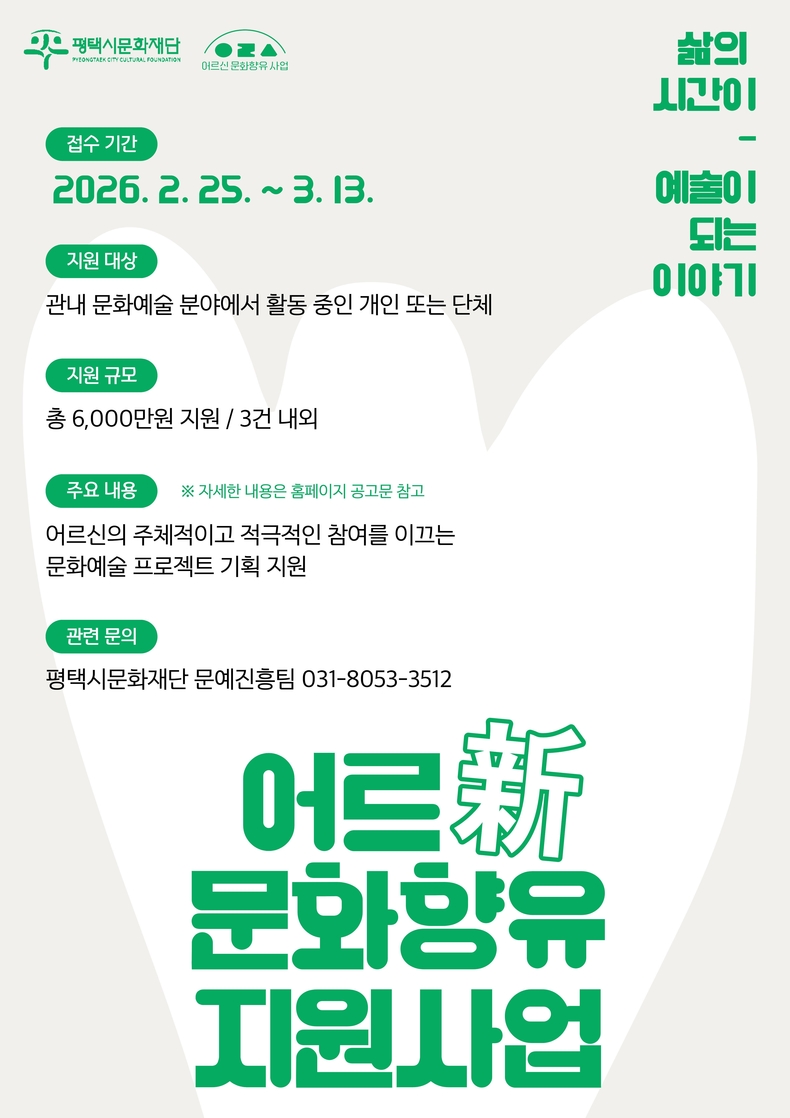 (시사미래신문) 평택시문화재단(대표이사 이상균)은 어르신이 삶의 경험을 바탕으로 문화예술의 주체로 참여하는 ‘2026년 어르新 문화향유 지원사업’ 공모를 오는 3월 13일까지 진행한다고 밝혔다.
