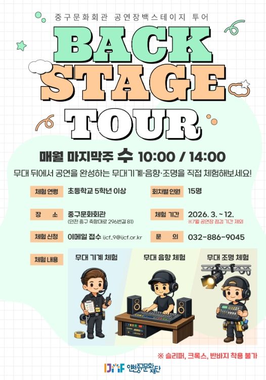 (시사미래신문) (재)인천중구문화재단은 시민들이 평소 접하기 어려운 공연장 무대 뒤 공간을 직접 체험할 수 있는 ‘2026년도 상반기 중구문화회관 백스테이지 투어’를 운영한다고 5일 밝혔다.