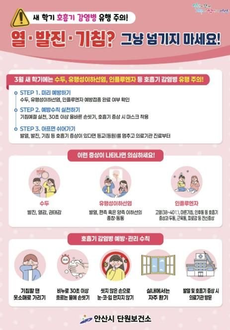 (시사미래신문) 안산시 단원보건소는 새 학기를 맞아 유치원과 초·중·고등학교를 중심으로 호흡기 감염병 발생 증가가 우려됨에 따라 학생과 교직원의 각별한 주의를 당부했다.