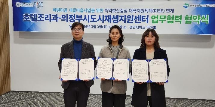 (시사미래신문) 의정부시도시재생지원센터는 3월 3일 경민대학교 호텔조리과와 성공적인 빼벌새뜰마을사업을 위해 업무협약을 체결했다.