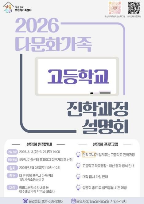 (시사미래신문) 포천시 직영 더 큰 행복 포천시가족센터가 오는 28일, '2026 다문화가족 고등학교 진학과정 설명회'를 개최한다.