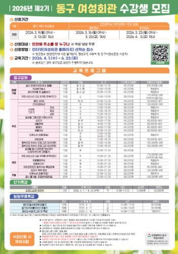 (시사미래신문) 인천 동구는 오는 3월 9일~4월 3일까지‘2026년 제2기 동구 여성회관’ 수강생을 모집한다고 밝혔다.