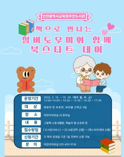 (시사미래신문) 인천광역시교육청주안도서관은 오는 3월 16일부터 10월 30일까지 영유아 및 보호자를 대상으로 ‘책으로 만나는 실버도우미와 함께 북스타트 데이’를 운영한다.