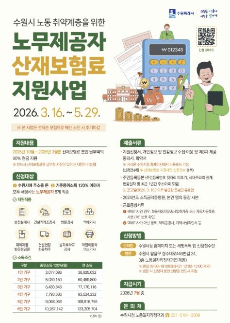 (시사미래신문) 수원특례시는 5월 29일까지 ‘2026년 상반기 노동 취약계층 노무제공자 산재보험료 지원사업’ 신청을 받는다.