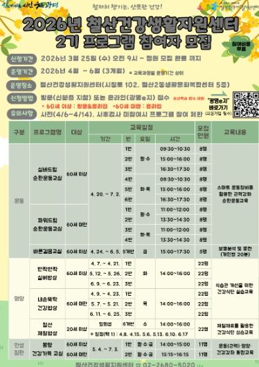 (시사미래신문) 광명시 보건소 철산건강생활지원센터가 ‘2026년 건강생활 프로그램 2기’ 참가자를 오는 25일 오전 9시부터 선착순 모집한다.