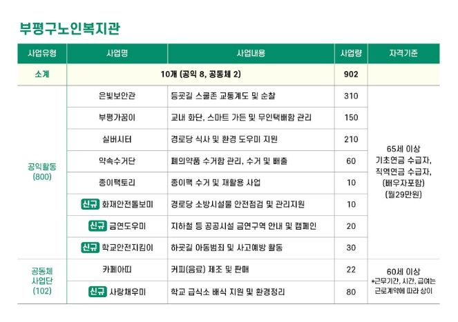 금년도 일자리사업은 은빛보안관(등굣길 교통지도 및 순찰), 부평가꿈이(학교 화단 및 시설 관리), 실버시터(경로당 식사 및 청소), 약속수거단(폐의약품 수거), 종이팩토리(우유팩 재활용), 화재안전돌보미(경로당 소방시설 점검), 금연도우미(공공장소 금연 안내), 학교안전지킴이(하굣길 안전 및 범죄 예방)이며, 카페아띠(복지관 커피매장), 사랑채우미(학교 급,배식 및 환경정리) 등 다양하게 운영되고 있다.