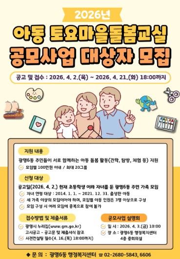 (시사미래신문) 광명시 광명6동 행정복지센터는 오는 21일까지 ‘2026년 아동 토요마을돌봄교실 공모사업’에 참여할 주민 가족 모임 20개 팀을 모집한다.