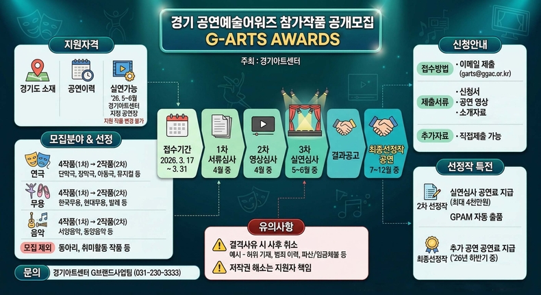 한편 「경기 공연예술어워즈」는 경기아트센터가 추진하는 공연예술 통합 브랜드 ‘G-ARTS’의 핵심 사업으로, 창작·유통·향유를 연결하는 공연예술 거버넌스를 실현하고 플랫폼으로 확장해 나가는 것을 목표로 하고 있다.