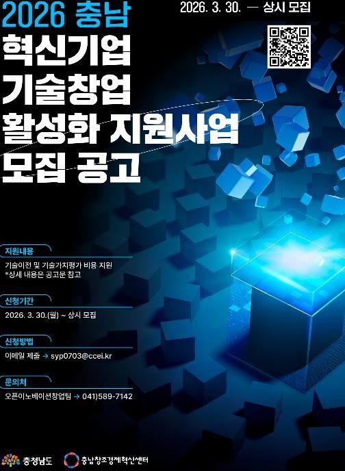 (시사미래신문) 충남창조경제혁신센터가 지역 창업기업의 기술 경쟁력을 높이고 성공적인 사업화를 돕기 위해 ‘2026년 충남 혁신기업 기술창업 활성화 지원사업’을 시행하고 참여 기업을 모집한다고 밝혔다.