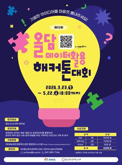 (시사미래신문) 충남창조경제혁신센터는 충남도내 대학 재학생을 대상으로 공공데이터를 활용한 창의적 아이디어 발굴을 위한 '제2회 올담 데이터 활용 해커톤' 참가자를 오는 5월 22일까지 모집한다고 밝혔다.