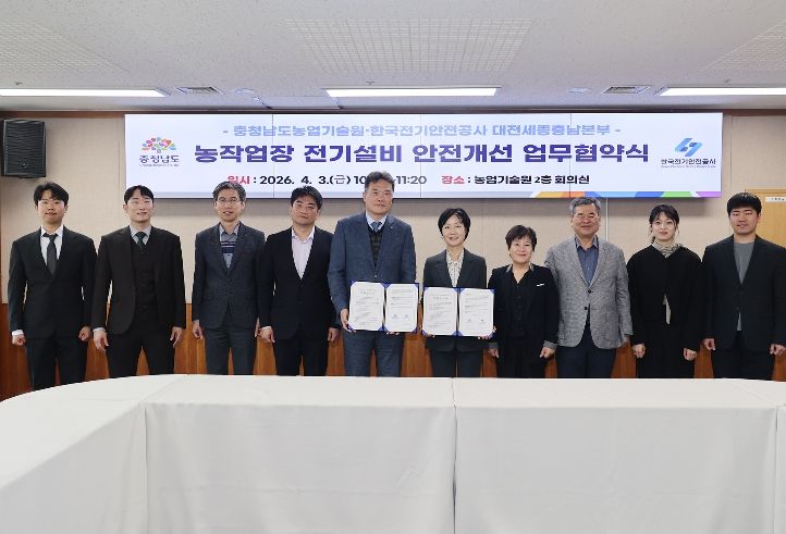 (시사미래신문) 충남도 농업기술원은 3일 기술원 회의실에서 한국전기안전공사 대전세종충남본부와 ‘농업현장 전기설비 안전진단 및 기술지원’을 위한 업무협약(MOU)을 체결했다.