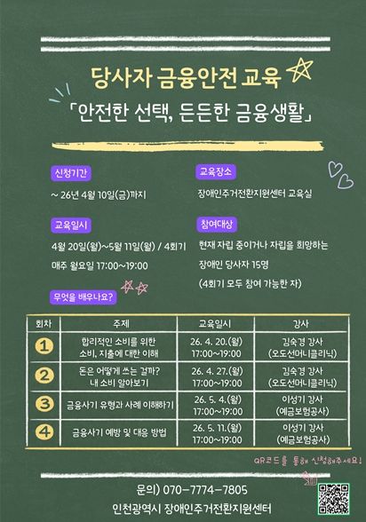 (시사미래신문) 인천시사회서비스원 소속 인천시장애인주거전환지원센터는 당사자 금융 안전교육 ‘안전한 선택, 든든한 금융 생활’ 참가자를 모집한다고 6일 밝혔다.