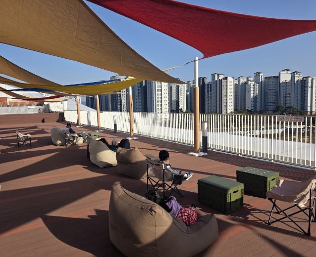충남도서관은 탁 트인 야외 공간인 하늘정원에서 도서관 이용자들이 편안하게 휴식을 즐기면서 책을 읽고 여유롭게 시간을 보낼 수 있도록 캠핑 의자와 빈백, 캠핑 박스 등을 설치했다.