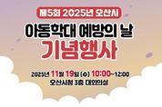 (시사미래신문) 오산시는 오는 19일 ‘아동학대예방의 날’과 ‘아동학대예방주간’을 맞아 기념행사 및 온·오프라인 캠페인을 실시한다고 12일 밝혔다. 행사는 19일 오전 10시부터 12시까지 오산시청 대회의실에서 진행되며, ▲1부 아동학대예방의 날 기념식 식전공연, 유공자 표창 시상, 퍼포먼스, ▲2부 부모교육 특별강연으로 구성된다. 특별강연은 리플러스 인간연구소 박재연 소장이 ‘부모를 위한 건강한 대화방법’을 주제로 진행한다. 매년 11월 19일은 아동학대 예방과 방지에 대한 사회적 관심을 높이기 위해 제정된 법정기념일로, 오산시는 매년 기념식과 강연, 캠페인 등을 통해 아동학대 예방의 중요성을 알리는 다양한 활동을 추진해오고 있다. 시는 이달 25일까지 온라인 릴레이 캠페인도 함께 진행한다. 오산시민 누구나 SNS에 아동학대예방 메시지 또는 관련 사진을 업로드해 참여할 수 있다. 또한 11월 24일에는 시청 인근 주요 교차로에서 시민 대상 오프라인 홍보 캠페인을 실시해 아동학대 예방 인식 제고에 나설 예정이다. 박현주 아동복지과장은 “이번 행사가 아동학대 예방의 중요성을 되새기고 아이들에게 더 따