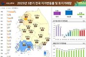 (시사미래신문) 국토교통부와 한국부동산원(원장 손태락)은 '25년 3분기 지가변동률 및 토지거래량을 발표했다. ★ 지가변동률 '25년 3분기 전국 지가는 0.58% 상승했다. 상승폭은 '25년 2분기(0.55%) 대비 0.03%p 확대, '24년 3분기(0.59%) 대비 0.01%p 축소된 것으로 나타났다. '25년 9월 지가변동률은 0.20%로, '25년 8월(0.19%) 대비 0.01%p, '24년 9월(0.19%) 대비 0.01%p 높은 수준으로 나타났다. (지역별) '25년 3분기 지가변동률은 수도권(0.74% → 0.80%)은 '25년 2분기 변동률 대비 높은 수준, 지방권(0.22% → 0.19%)은 낮은 수준을 보였다. (시·도) 17개 시·도 중 서울(1.07%)이 전국 평균(0.58%)을 상회했다. (시·군·구) 서울 용산구 1.96%, 서울 강남구 1.68%, 서울 서초구 1.35% 등 252개 시군구 중 40개 시군구가 전국 평균을 상회했다. 또한, 252개 시군구 중 199개 시군구가 0.00% ~ 0.80% 수준을 나타내었으며, 주로 수도권 지역을 중