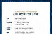 (시사미래신문) 김천상무 공식 서포터즈 ‘수사불패’가 멤버십 회원을 모집한다. 김천상무 공식 서포터즈 수사불패가 1월 28일부터 시즌 종료 시까지 ‘2026 서포터즈 멤버십’ 회원을 모집한다. 멤버십은 선착순 200명 한정으로 운영되며, 가입비는 14세 이상 10만 원, 14세 미만 7만 원이다. 이번 서포터즈 멤버십은 ‘역대급 혜택’으로 구성됐다. 먼저 멤버십 회원은 김천상무 홈경기 시 선수들과 가장 가까운 곳에서 응원의 열기를 느낄 수 있는 서포터즈석(N2, N3구역) 입장권을 정액 7천 원에 구매할 수 있다. 동시에 가입회원 본인에 한해 서포터즈석 선예매가 가능하다. 다양한 이벤트 혜택도 있다. 서포터즈 특화 행사 참여 기회가 제공되며, 홈경기 서포터즈석 티켓 지원, 원정경기 티켓 일부 지원 혜택도 받을 수 있다. 멤버십 패키지 구성 또한 풍성하다. 서포터즈를 형상화한 멤버십 실물카드와 랜야드가 기본으로 제공되며, 14세 이상 가입자는 구단 공식 의류 후원사 켈미 바람막이를 받을 수 있다. 14세 미만 가입자는 구단 공