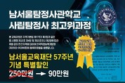 (시사미래신문) 남서울대학교 가족기관인 남서울평생교육원 부설 남서울탐정사관학교가 오는 10월 17(금)까지 '사립탐정사 최고위과정' 제23기 신입생을 모집한다고 밝혔다. 이번 23기 과정은 남서울교육재단 기념 특별 장학 혜택으로 정가 250만 원의 수강료를 90만 원으로 대폭 할인하여 제공하며, 전문 탐정을 꿈꾸는 이들에게 최고의 기회가 될 것이다. 본 과정은 경찰청에 등록된 민간조사(탐정사) 자격취득 과정으로, 각 분야 최고 전문가들이 실무 중심의 교육을 제공한다. 전현직 전임 대학교수, 경찰청, 경찰대학 기관 수사팀원, M&A 투자협회 전문팀, AI디지털융합교육원 잔문강사, 전직 국방군사법원장, 현직 로펌 변호사, 인문학 전문강사, 스피치 리더십 최고 전문가 현직 원장급 등 경험이 풍부한 전문가들이 강사로 참여해 생생한 지식과 노하우를 전수할 예정이다. 교육은 10월 18일(토) 오후3시부터 12월 6일(토)까지 총 8주간 매주 토요일에 총 15명의 전문 강사로 진행된다. 커리큘럼은 다음과 같이 탐정 실무에 필수적인 내용으로 구성되어 있다. 탐정의 기본 소양으로 투명경영과 기업가 정신, 탐정의 사고와 비전전문 실무로는 기업 인수합병(M&A)
