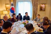 (시사미래신문) 유엔총회 참석을 계기로 방미 중인 이재명 대통령이 22일(현지시간) 첫 번째 일정으로 세계경제포럼(WEF) 의장인 블랙록의 래리 핑크 회장, GIP의 아데바요 오군레시 회장, 김용 전 세계은행 총재와 만났다. 이번 만남에선 인공지능과 에너지 전환, 인구 변화라는 인류의 세 가지 대전환 과제를 중심으로 논의가 이뤄졌으며, 동시에 한국과 글로벌 투자사 간 전략적 협력을 위한 공감대를 확인했다. 래리 핑크 회장은 AI와 탈탄소 전환은 반드시 함께 진행되는 것이 중요하고, 이는 전 세계가 함께 가야 할 문제라고 강조하면서 한국이 "아시아의 AI 수도(AI Capital in Asia)"가 될 수 있도록 글로벌 자본을 연계하여 적극 협력하겠다는 의지를 밝혔다. 이재명 대통령은 한국의 아시아태평양 AI 수도 실현을 위해 협력할 수 있게 되어 환영하며, 긴밀하고 지속적인 논의를 통해 이번 협력 관계를 실질적인 협력 성과로 이어지게끔 하자고 강조했다. 또한 래리 핑크 회장을 직접 한국에 초대하기도 했다. 래리 핑크 회장 일행은 이재명 대통령의 리더십으로 취임 이후에 대한민국 증시가 사상 최고