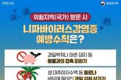 (시사미래신문) 평택시는 최근 인도(서벵골주)에서의 니파바이러스 감염증 환자가 발생하여 해당 국가를 방문하는 시민들에게 감염 예방을 위한 각별한 주의를 당부했다. 니파바이러스 감염증은 1998년 말레이시아에서 처음 보고된 인수공통감염병으로, 인도(누적 환자 104명, 사망 72명), 방글라데시(누적 환자 343명, 사망 245명) 등 아시아 지역에서 산발적으로 발생했고 발열, 두통, 근육통 등으로 시작하여 의식 장애 등 신경계 증상으로 악화되는 것으로 알려져 있다. 또한 치명률은 40~75%에 이르고 현재 치료제 및 백신이 없으므로 감염 예방이 매우 중요하다. 발생 국가 여행 시에는 ▲과일박쥐나 아픈 돼지 등 동물과의 접촉 피하기 ▲생 대추야자수액 등 오염된 음료나 바닥에 떨어진 과일 섭취 금지 ▲환자의 혈액·체액 접촉 피하기 ▲30초 이상 손 씻기 ▲씻지 않은 손으로 눈, 코, 입 만지지 않기 등의 예방수칙을 철저히 준수해야 한다. 귀국 후 14일 이내에 의심 증상 발생 시 질병관리청 또는 관할 보건소로 신고해야 한다. 평택시 송탄보건소 관계자는 “니파바이러스 감염증은 사망률이 높지만 개인 위생수칙을 철저히