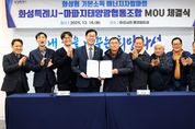 (시사미래신문) 화성특례시는 16일 시청 중앙회의실에서 마파지태양광협동조합과 ‘화성형 기본소득 에너지자립마을 조성을 위한 업무협약(MOU)’을 체결했다. 이날 협약식에는 정명근 화성특례시장을 비롯해 김진원 마파지태양광 협동조합장 등이 참석해, 주민주도형 재생에너지 기반 에너지자립마을 조성사업의 추진에 상호 협력하기로 했다. 이번 사업은 국유지를 활용해 주민이 사업비 전액을 부담해 100% 주민주도형 ‘에너지자립마을’을 조성하는 경기도 최초 사례로, 재생에너지 수익을 마을 복지와 기본소득으로 연계하는 ‘화성형 기본사회’ 정책의 첫 시범 모델이다. 마파지태양광협동조합은 석포6리 주민 25가구가 공동 운영하는 협동조합으로, 사업주체로서 장안면 석포리 823번지 제방 국유지에 415kW 규모의 태양광 발전설비를 설치한다. 사업비는 총 5억 2천만 원으로 전액을 주민이 자부담한다. 시는 협약에 따라 인허가, 관계기관 협의, 제도 검토 등 사업 추진에 필요한 행정적·제도적 지원을 담당하고, 에너지자립마을이 안정적으로 운영될 수 있도록 정책적 기반 마련에 협력한다. 또한 재생에너지 수익이 마을 복지