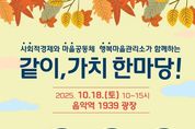 (시사미래신문) 가평군은 오는 18일 오전 10시부터 오후 3시까지 음악역 1939 광장에서 주민과 함께하는 축제 ‘2025년 같이, 가치 한마당’을 연다. 이번 행사는 사회적경제기업의 판로 확대와 마을공동체, 경기행복마을관리소의 활동 성과를 알리고 주민 참여를 확대하기 위해 마련됐다. 행사에는 사회적경제기업 5곳, 마을공동체 16곳, 경기행복마을관리소 4곳 등 총 25개 단체가 참여한다. 이날 주민들은 현장에서 직접 사회적경제기업의 제품을 구매할 수 있으며, 공동체별 특색 있는 프로그램을 즐길 수 있다. 주요 프로그램은 △사회적경제기업 생산품 홍보·판매 △공동체와 경기행복마을관리소 활동 전시 및 무료 체험 △합창·뮤지컬 갈라쇼·힐링체조 등 공연 △경품 이벤트 등이 마련돼 있다. 특히 가평마을교육공동체가 제작한 단편영화 상영 등 주민 주도 콘텐츠도 선보일 예정이다. 가평군 관계자는 “‘같이, 가치 한마당’ 축제를 통해 지역사회에서 사회적경제와 공동체 활동이 더욱 확산되기를 기대한다”며 “이번 행사가 지역경제의 활력으로 이어질 수 있도록 주민 여러분의 많은 방문과 성원을 부탁드린다”고 말했다